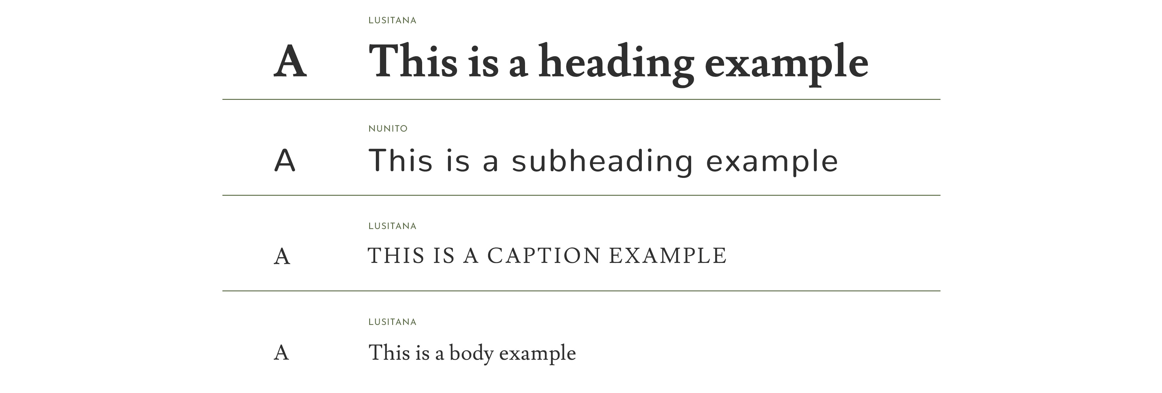 Typography is a combination of warm, welcoming and down-to-earth font that is Lusitana and a modern, well balanced clean and easy to read Nunito, which makes it ideal for the brand audience of all ages.